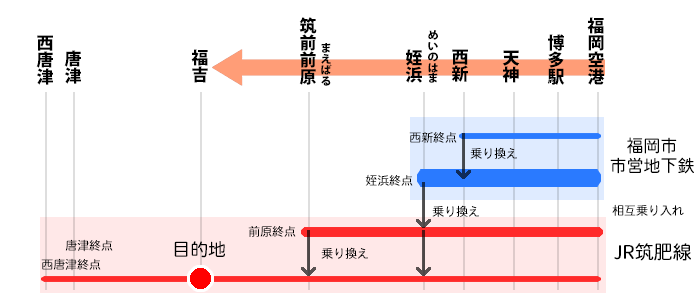 福岡空港、博多駅、天神からだと、西唐津(からつ)行き、前原(まえばる)行き、姪浜(めいのはま)行きに乗っていただければ、目的地の「福吉」に近づきます。