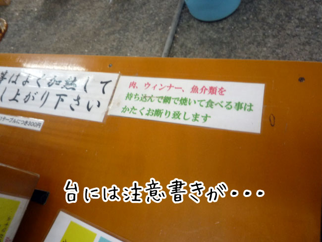 持ち込み品を網の上で焼くと、異常に煙が出て大迷惑になったり、網にこびりついたりして、掃除などが大変なんだそうです。 ご協力くださいね。