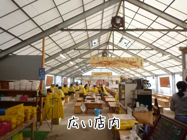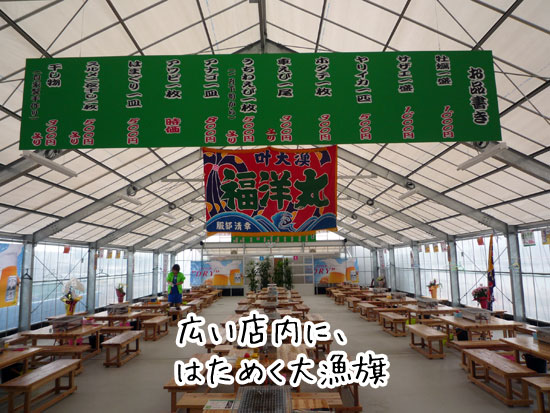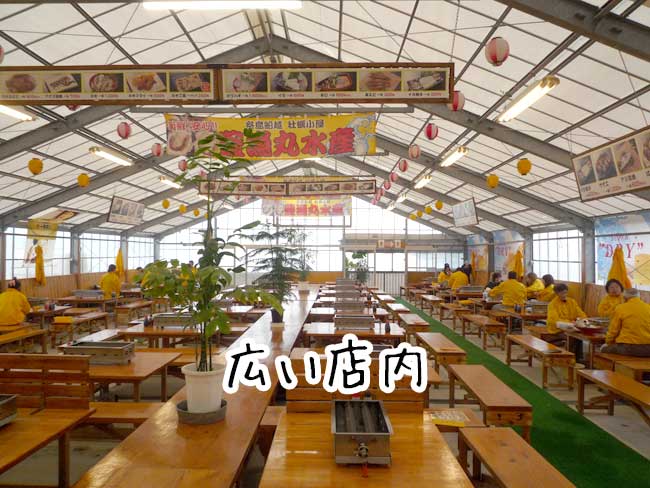 船越漁港の牡蠣小屋は、1棟当たり平均して200名のお客さんを一度に収容できる大型の店舗です。 そのような大型店舗が、同じ敷地内に8店舗並んでいるんです。推測ですが、日本最大級の牡蠣小屋群だと思います。